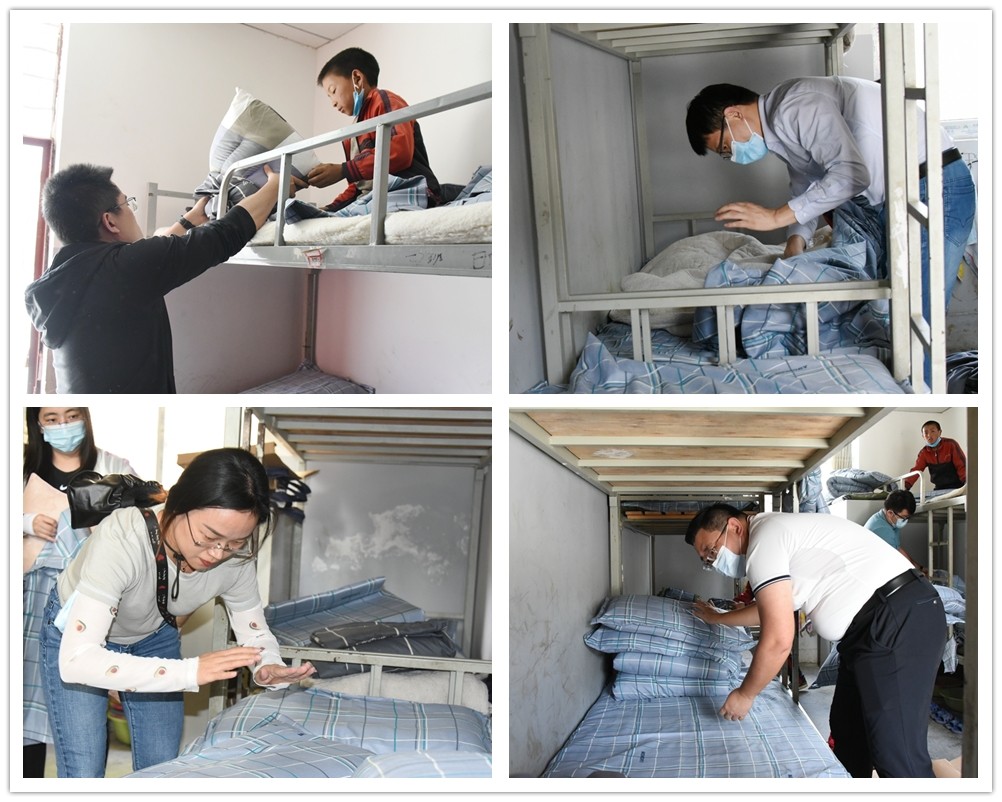 學(xué)員們和學(xué)生一起鋪設(shè)嶄新的床單、被套等